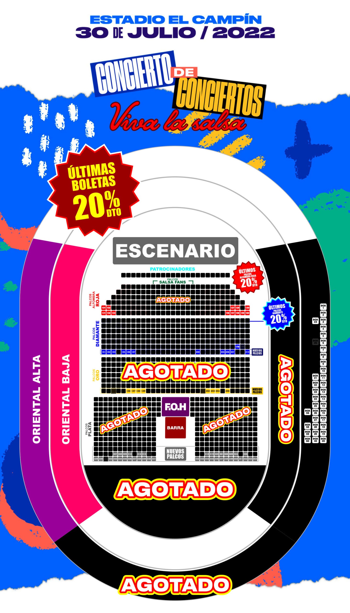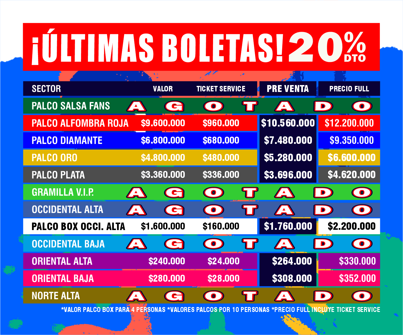 Localidades disponibles: Norte Alta, oriental baja, oriental alta, occidental baja, occidental alta, gramilla VIP, palco plata, palco oró, palco diamanté, palco alfombra roja, palco salsa fans.