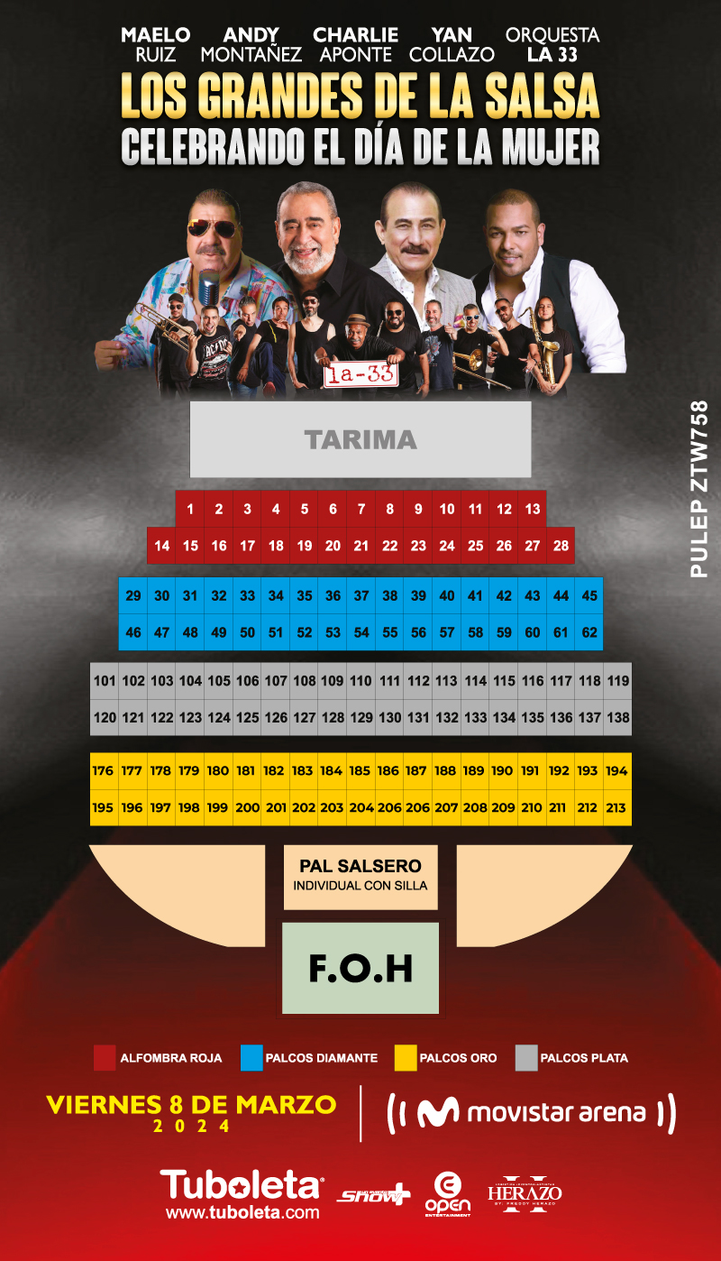 Los Grandes exponentes de la Salsa, se unen este 8 de marzo de 2024 para celebrar a lo grande el Dia Internacional de la Mujer. Una fiesta inolvidable que viviremos en el Movistar Arena de Bogotá, junto a: ANDY MONTAÑEZ, MAELO RUIZ, CHARLIE APONTE, YAN COLLAZO & LA ORQUESTA LA-33.